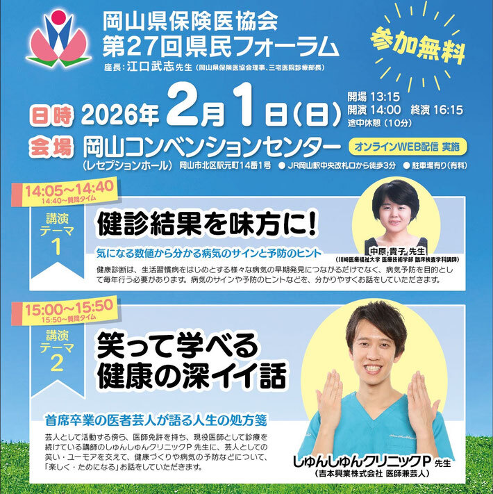 2月1日(日)、岡山県保険医協会「第27回 県民フォーラム」に、三宅医院 診療部長 江口武志(岡山県保険医協会理事)が座長として参加します。
