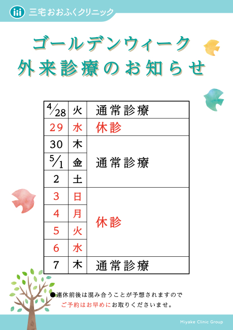 ゴールデンウィークの外来診療および休診日は下記の通りとさせていただきます。何卒よろしくお願い申し上げます。